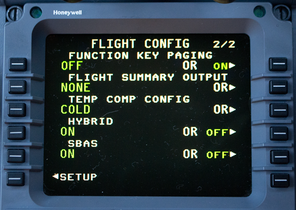 The first step in the temperature compensation activation procedure is to configure the desired temperature compensation. Temperature compensation configuration is performed on the TEMP COMP CONFIG page. The TEMP COMP CONFIG page is accessed from the FLIGHT CONFIG page 2.