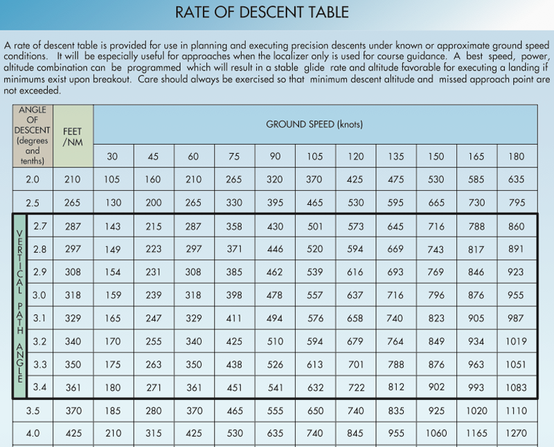 If you don't have an FMS that does all this for you, or if you are flying an approach that prevents your FMS from doing all this for you, this table gives you an idea of what vertical descent rate you are going to need. If you don't have the table, you can approximate a 3° angle of descent by dividing your groundspeed by 2 and multiplying that by ten. A 120 knot ground speed, for example, yields 600 fpm.